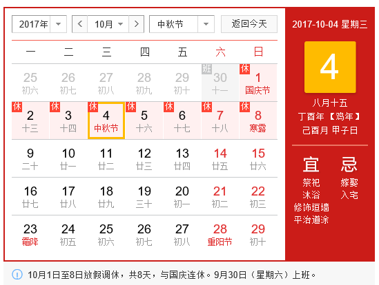 2017年中秋節是10月4日(星期三),故而與國慶節連休放假共8天(10月1日-10月8日)。9月30日(星期六)上班。