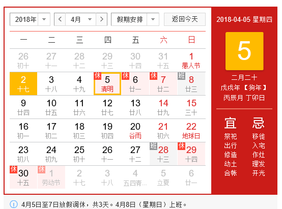 4月5日(星期四,清明節)至7日放假調休,共3天。