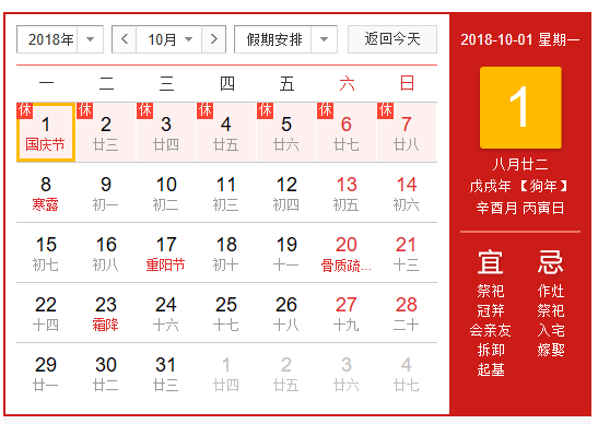 根據(jù)國務(wù)院2018年國慶節(jié)放假規(guī)定及結(jié)合我司情況具體安排如下:10月1日-7日放假,共7天。