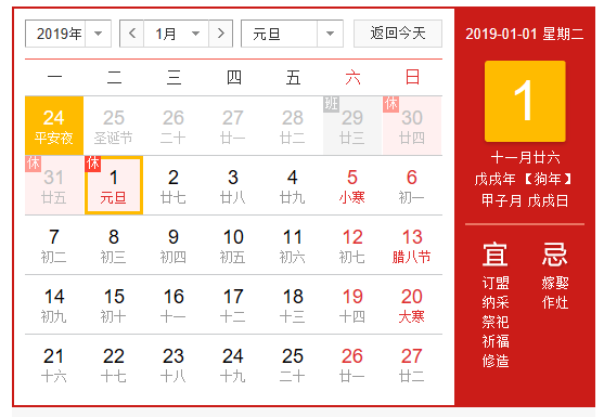 2018年12月30日至2019年1月1日放假調休,共3天。