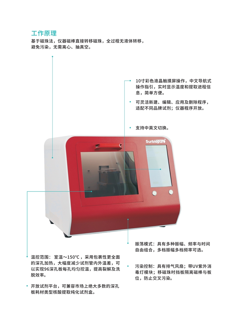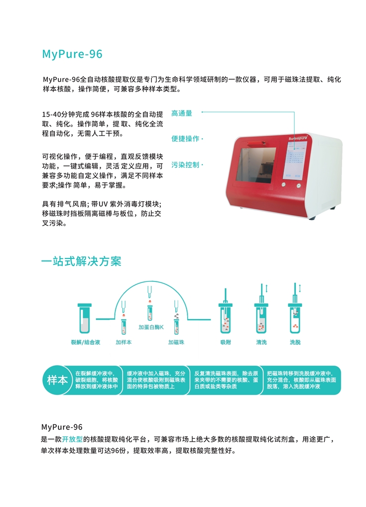 15-40分鐘完成96樣本核酸的全自動(dòng)提取、純化。操作簡(jiǎn)單,提取,純化全流程自動(dòng)化,無(wú)需人工干擾。