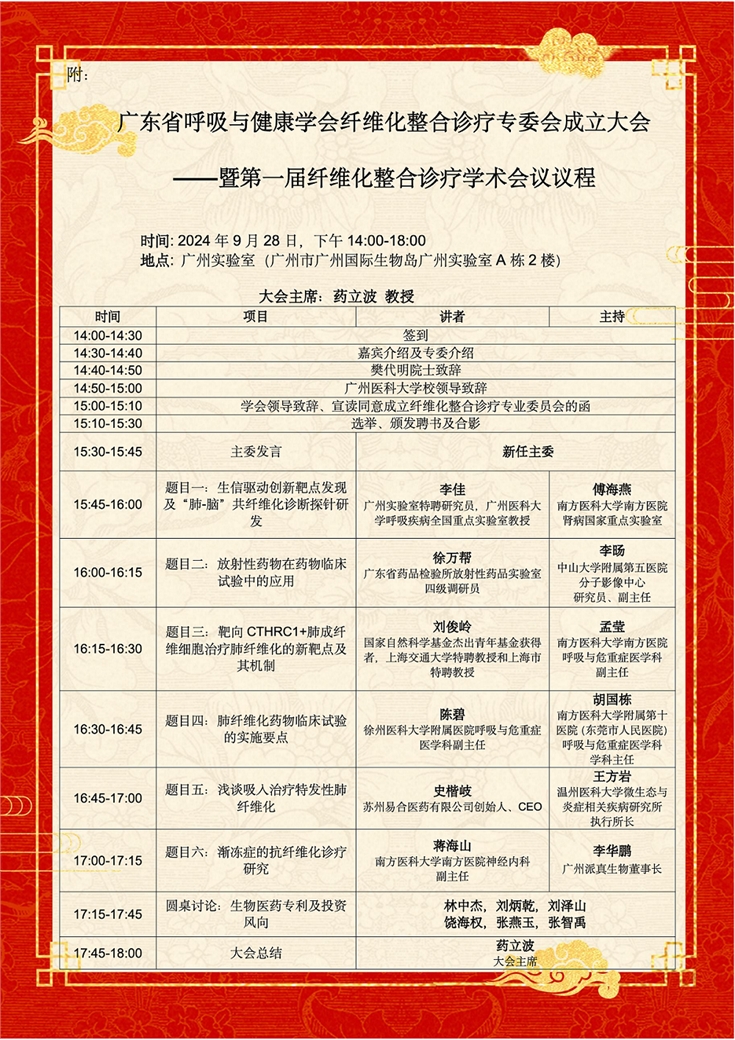 再次祝賀廣東省呼吸與健康學會纖維化整合診療專委會的成立,為推動器官纖維化疾病的應用基礎研究與臨床應用做出貢獻。