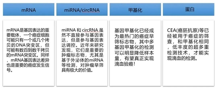 1. 種類多的標志物:要想使用“滴血”進行癌癥檢測,單一標志物含量太少,要選用種類多的標志物來彌補:如 mRNA / miRNA / circRNA /蛋白等。