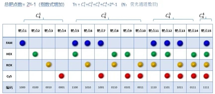 小海龜科技專注在超多重數(shù)字 PCR 領(lǐng)域深耕,基于其創(chuàng)新的多色熒光編解碼技術(shù),可同時檢測單個反應(yīng)的幾十種靶標(以 6 路熒光為例,理論可實現(xiàn) 63 重檢測),降低樣本使用量,提高準確性:
