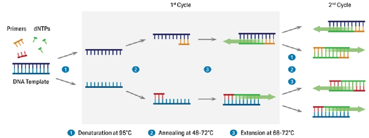 延伸:(70℃-75℃):在Taq酶(在72℃左右,活性最佳)的作用下,以dNTP為原料,從引物的3′端開始以從5′→3′端的方向延伸,合成與模板互補的DNA鏈。