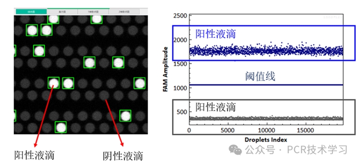 在一維散點圖中,每個液滴或腔室的熒光信號,都用一個點表示,橫坐標表示液滴的序號,縱坐標表示液滴的熒光強度值。通常情況下,如果1個或多個目標模板 DNA 分子存在于某個液滴中,并實現了PCR擴增時,就會產生熒光信號(基于探針或EvaGreen染料)。通常,一個有陽性模板樣本的結果,會在散點圖上看到兩個聚類的信號層,上面的聚類的是陽性(含有1個或多個分子),下面的聚類為陰性(不含分子)。系統軟件或用戶手動設置兩個聚類之間的閾值,以確定哪些液滴為陽性,哪些為陰性。然后使用泊松公式計算,以確定樣品中的分子數量。