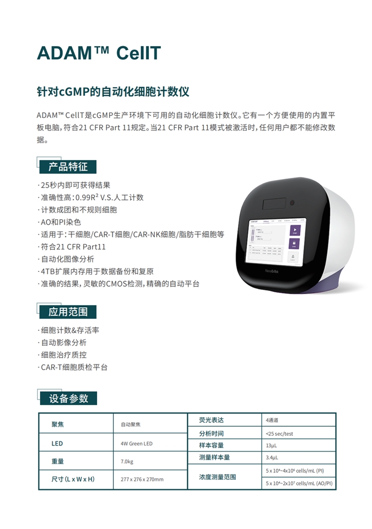 ADAM?CellT是cGMP生產環境下可用的自動化細胞計數儀。它有一個方便使用的內置平板電腦,符合21 CFR Part 11規定。當21 CFR Part 11模式被激活時,任何用戶都不能修改數據。