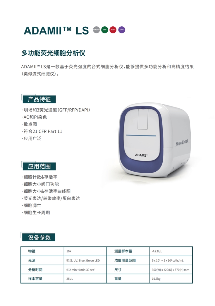 產品型號:ADAMII?LS多功能熒光細胞分析儀
